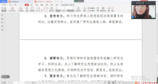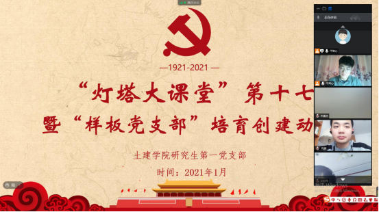 为进一步规范党支部的组织生活,提高支部党员的理论学习水平,深入推进“研究生样板党支部”的培育创建工作,确保党员队伍放假“不掉线”。1月28日下午,MK体育研究生第一党支部通过腾讯会议线上召开支部大会,集中组织学习了“灯塔大课堂”第十七讲,并就“研究生样板党支部”的创建工作作了动员,研究生第一党支部全体党员、学工办老师沈娇及部分入党积极分子代表参与了本次会议,会议由党支部书记韩一鸣主持。