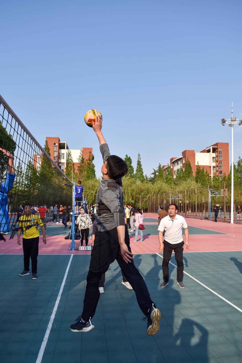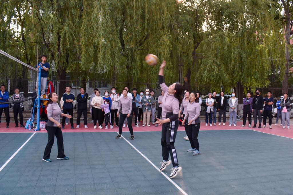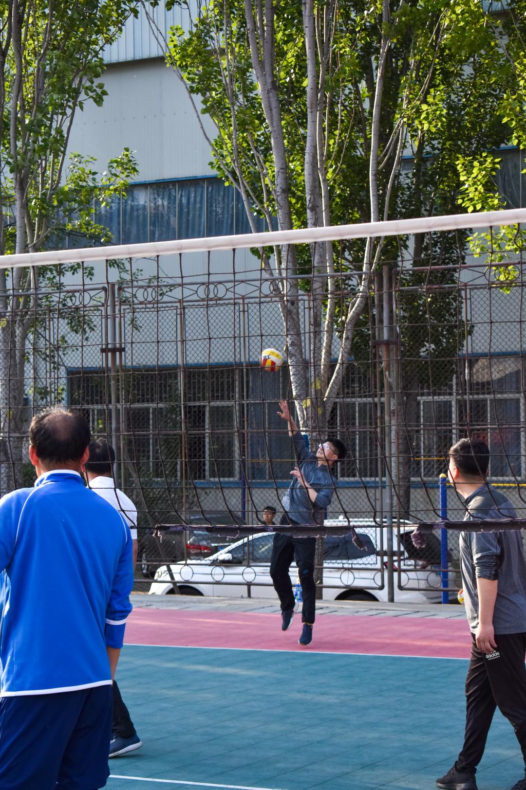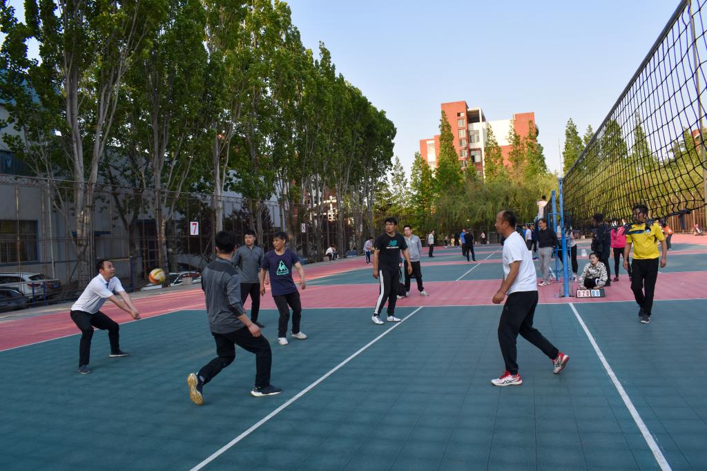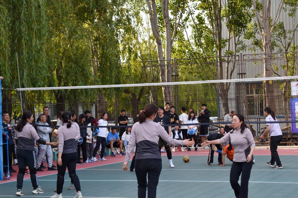 随着一声哨响,教学课堂中温文尔雅的老师,摇身一变判若两人,发球有力、气势如虹。一传、二传、主攻、副攻分工协作;发球、垫球、传球、每个环节尽力发挥,那出其不意的扣杀和匪夷所思的防守让在场的观众欢呼不断。教职工们配合默契,技术精湛,强力扣杀、以快制快、机智轻吊和顽强救球一系列绝技层出不穷,酣畅淋漓的比赛为全校师生呈现了一场体育盛宴。