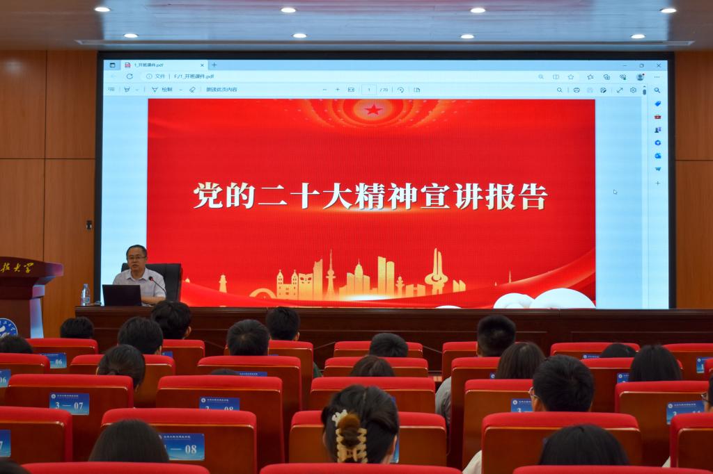 王崇革聚焦党的二十大主题和主要成果、过去5年的工作和新时代10年的伟大变革、中国式现代化等主题,对党的二十大精神进行了深入阐释。教育引导员工党员要原汁原味深入学习领会党的二十大精神,弘扬伟大建党精神,拥护“两个确立”,坚定不移在思想上、政治上、行动上同以习近平同志为核心的党中央保持高度一致。王崇革指出,党的二十大担负起全党的重托和人民的期待,从战略全局深刻阐述了新时代坚持和发展中国特色社会主义的一系列重大理论和实践问题,科学谋划了未来一个时期党和国家事业发展的目标任务和大政方针,在党和国家历史上具有重大而深远的意义。王崇革希望土建学子要细照笃行,起而行之,踔厉奋发,做有理想信念、做敢作敢为、脚踏实地的青年,在“真刀真枪”的实干中成就一番事业。