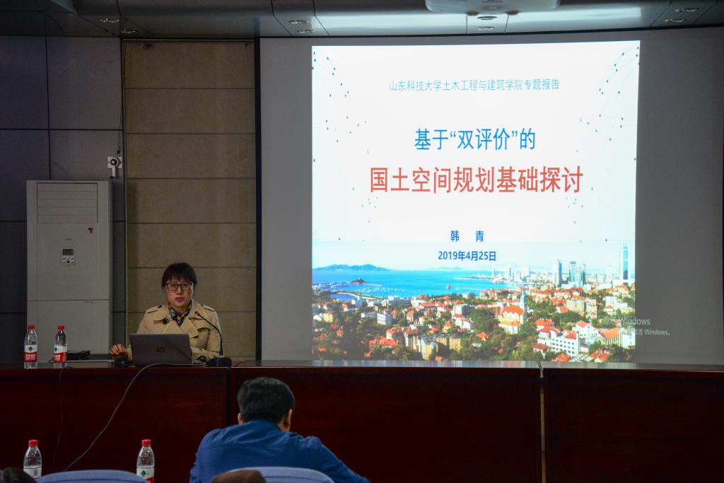 4月25日下午,青岛市自然资源和规划局韩青研究员在J15-219为公司师生作了题为“基于双评价的国土空间规划编制基础探讨”的报告。公司党委书记张东、城乡规划系主任代朋及师生代表参加了本次活动,报告由代朋主持。