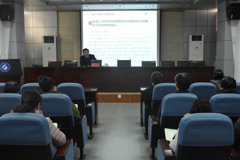张英杰以《新阶段新理念新格局——党的十九届五中全会精神解读》为题,从学科培养体系出发,逻辑清晰地从基本情况、主要精神、学习重点三个方面对党的十九届五中全会精神进行系统解读,并结合公司实际和个人亲身经历,分享个人对深入学习贯彻党的十九届五中全会精神的感悟体会。张英杰指出,党的十九届五中全会谋划长远,立足五年,着眼十五年,放眼百年,为中国擘画了一幅波澜壮阔的新图景,实践再次证明,有习近平同志作为党中央的核心、全党的核心领航掌舵,有全党全国各族人民团结一心、顽强奋斗,我们就一定能够战胜前进道路上出现的各种艰难险阻,一定能够在新时代把中国特色社会主义更加有力地推向前进。最后,张英杰强调,公司师生均应深入贯彻落实党的十九大、党的十九届五中全会精神,为开启全面建设社会主义现代化国家新征程、开创新时代现代化强省建设新局面,为把公司建设成为工科主导、特色鲜明的高水平应用研究型大学贡献自己的力量。