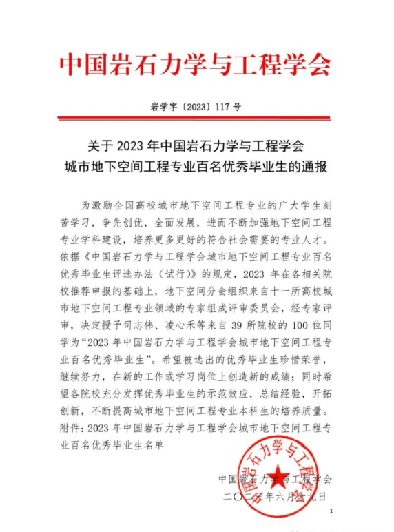 据悉,该活动由中国岩石力学与工程学会依据《中国岩石力学与工程学会城市地下空间工程专业优秀毕业生评选办法(试行)》的规定,组织来自十一所高校城市地下空间工程专业领域的专家组成评审委员会,经专家评审授予来自39所院校的100名员工为“2023年中国岩石力学与工程学会城市地下空间工程专业百名优秀毕业生”MK体育共推荐了3人参与评选,最终3人全部评上。此项活动旨在表彰先进、树立典型,激励全国高校城市地下空间工程专业广大学予以服务国家城市地下空间工程建设事业发展为己任,刻苦学习、积极实践、勇于创新、全面发展。同时,切实发挥优秀毕业生示范效应,总结经验、开拓创新,不断提高城市地下空间工程专业本科生培养质量,培养更多更好的符合社会需要的专业人才。
