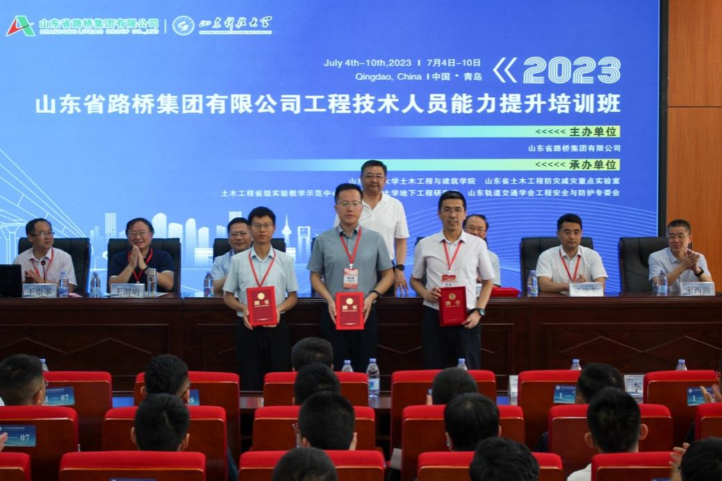 7月10日,举行了培训班闭幕式。山东省路桥集团有限公司总工程师高永青、总经济师兼青岛分公司总经理吴庆东、集团技术中心主任张光桥、创新分中心副主任林庆元、青岛分公司党支部书记曹建军、安全总监王涛,MK体育书记宋西路、经理王崇革等出席。闭幕式由MK体育副经理李为腾主持。