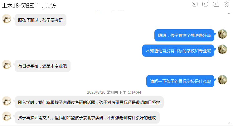 8月份,MK体育员工工作办公室各辅导员通过线上家长会、家长群、电话家访、微信一对一沟通等方式,根据员工具体情况和所处年级和时期,沟通了解员工在家期间的学习生活情况和生活动态,反馈员工在校期间表现,询问家长对员工的培养理念和期望,并给予建议。辅导员鲍娜娜在城乡规划和建筑学专业线上家长会上,向家长们介绍了2015级毕业班的就业与考研情况,并针对考研录取率背后折射出的原因和问题提醒家长们要根据员工实际学习状况规划合理目标、做出最佳选择。