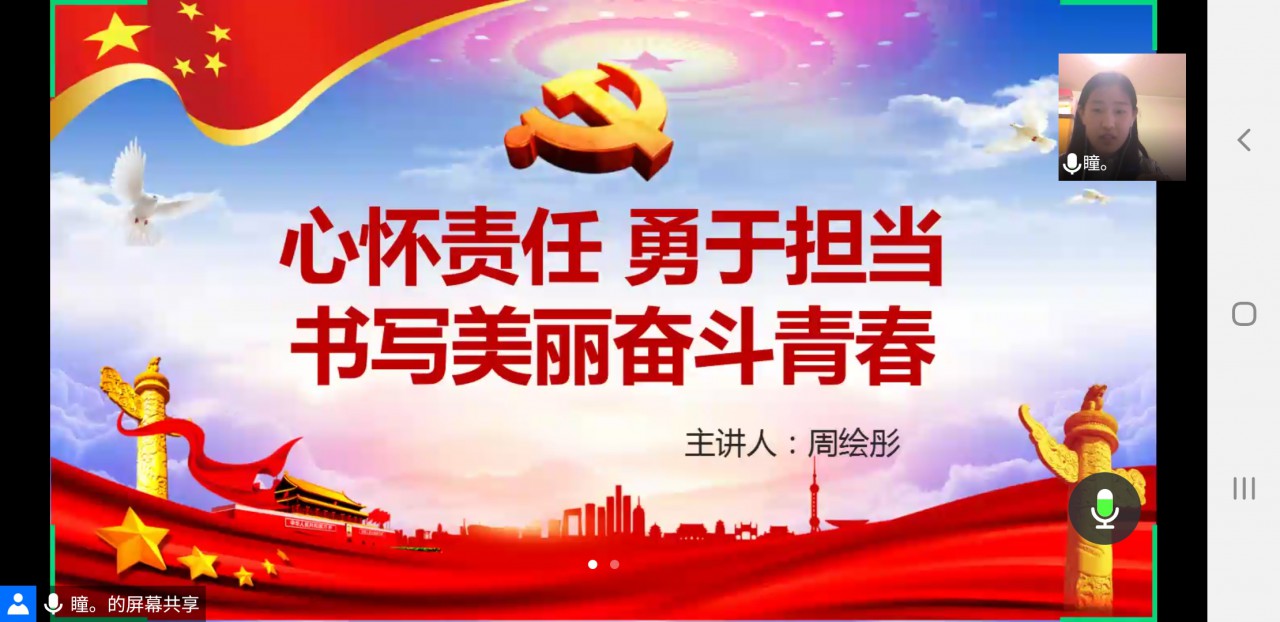 近日,由MK体育官网校研究生会学术部与初心使命研究生理论学习小组主办、MK体育研究生会承办的思政类研究生讲坛第9讲通过腾讯会议APP平台成功举办。2017级硕士研究生周绘彤担任主讲人,讲坛题目为《心怀责任,勇于担当,书写美丽奋斗青春》。