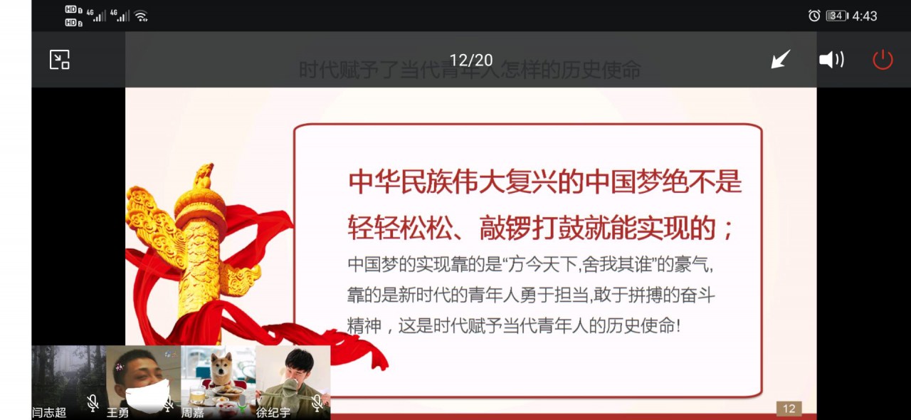 下午四时,微团课正式开始。首先,主讲人周嘉以一段有关一位老员工在疫情下的遭遇以及疫情发展的过程的视频为例,从我国体制机制、党的正确决策、全民战疫等方面,分析我国为何能取得疫情防控的阶段性胜利。随后,他又立足于青年一代,分析了时代赋予当代青年人怎样的历史使命,并以抗疫中优秀青年人代表大的事例,进一步引导同学们反思青年一代应当如何为中国梦的实现贡献自己的力量。最后,主讲人赵鑫源与同学们一起讨论了面对时代大任时,新时代青年应该如何去做。他总结道:“青年人要树立信仰,为青春定向;学好知识,用知识为青春赋能;努力奋斗,用奋斗为青春添彩;争做新时代新青年,牢记使命,锻造本领”。