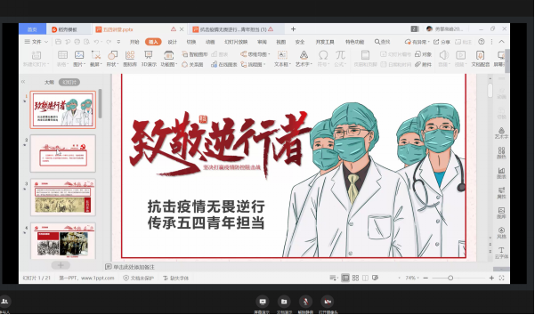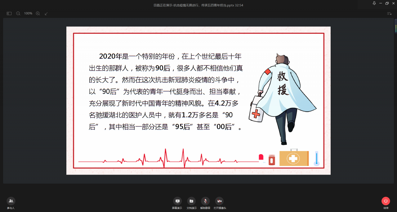 活动伊始,尚军对公司关于开展“青春心向党·建功新时代”五四主题团日活动进行了安排部署,带领同学们一起重温了习近平总书记给援鄂“90”后党员回信、以及对青年工作的重要论述,希望广大团员青年传承五四精神,积极践行习近平新时代中国特色社会主义思想,牢记时代赋予的职责使命。林琪琪为同学们讲解了五四运动的相关历史以及五四爱国主义精神的内涵。通过观看武汉医护剪辑纪录片,同学们纷纷为医护逆行者们用自己的实际行动诠释五四爱国精神的做法点赞。随后,田晶又向同学们具体剖析了在疫情中那一个个感人的九零后故事,进一步引导同学们对五四精神的反思。