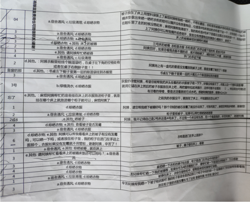 上午,MK体育辅导员们按照同学们需求进入宿舍进行服务,帮助员工晾晒衣服,整理宿舍卫生,给已经干枯的绿植浇水,给宿舍通风,把同学们需要晾晒的被褥放到阳台晾晒或者抱到繁星广场晾晒。下午,老师们把晾晒好的被子和衣服整理好放回员工宿舍,整理好宿舍卫生,关好宿舍门窗后离开。