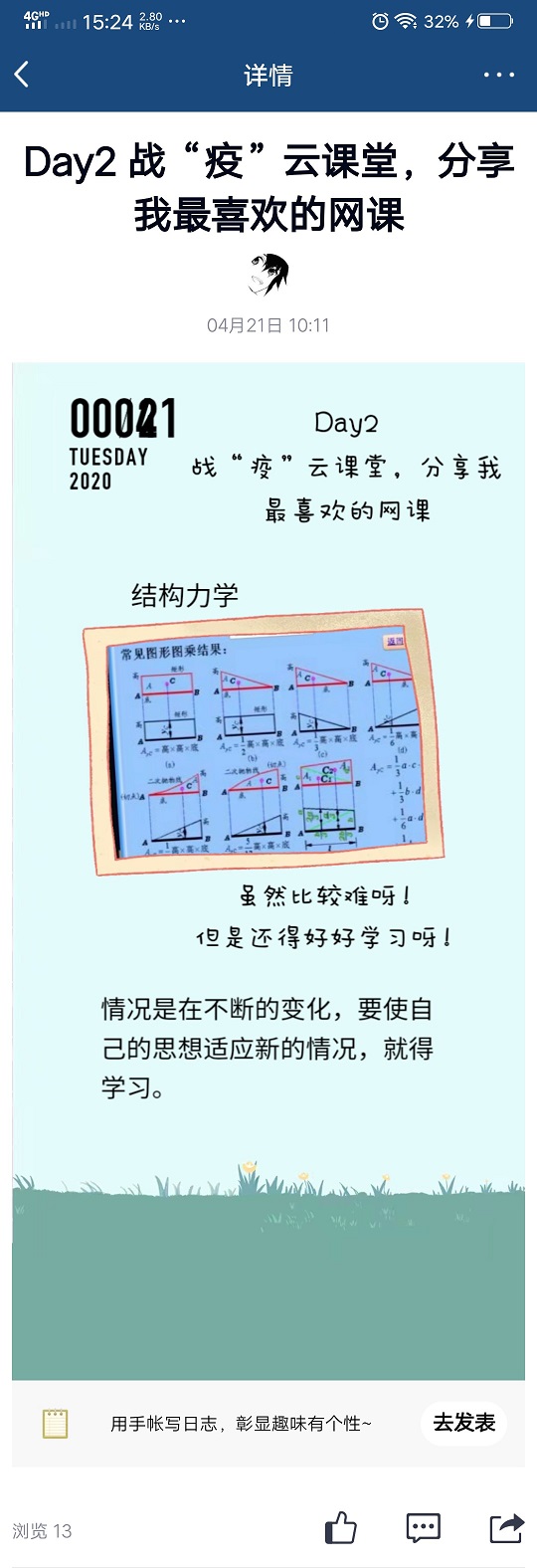 第一天的分享主题为“宅学抗‘疫’,晒晒我的学习笔记”,同学们使用QQ手账的方式晒出自己的学习笔记,分享自己的学习心得与乐趣。第二天的分享主题则是“战‘疫’云课堂,分享我最喜欢的网课”,同学们积极分享有趣网课,晒出自己喜欢的老师,写下自己的听课感想。