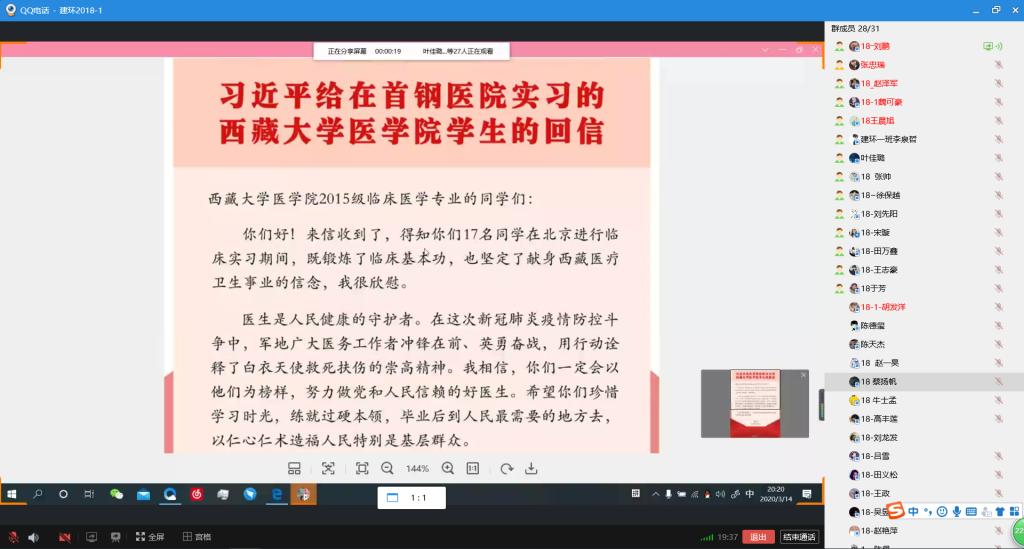 建环17-2班孔为龙说:“作为当代老员工,我为祖国的担当感到自豪。而要想打赢这场战争,我们必须要充分认识习近平总书记重要回信的深刻内涵和重大意义,要做新时代的中国青年!我们在以广大医务工作者为榜样的同时,也要练就自身过硬本领,用科学武装头脑,从自我做起,珍惜学习时光,毕业后建设国家,以仁心仁术造福人民。”