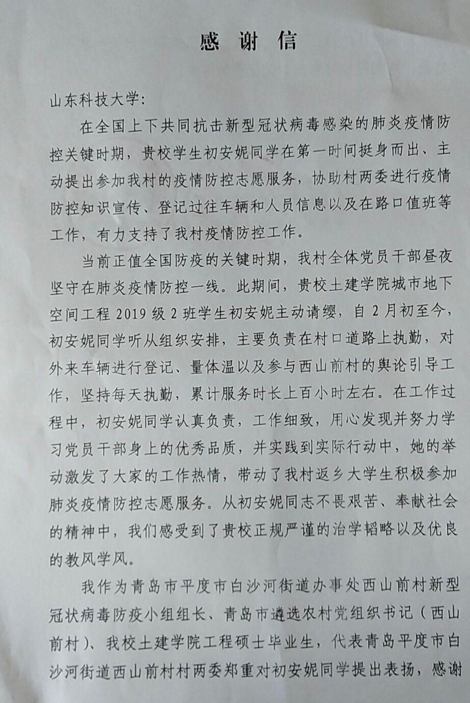 近日,MK体育收到中共平度市白沙河街道西山前村支部委员会的感谢信,了解到在全国上下共同抗击新冠肺炎疫情的时候,公司城市地下空间工程2019级2班员工初安妮也主动站到了抗“疫”前线,在青岛平度市白沙河街道办事处西山前村提供疫情防控志愿服务。