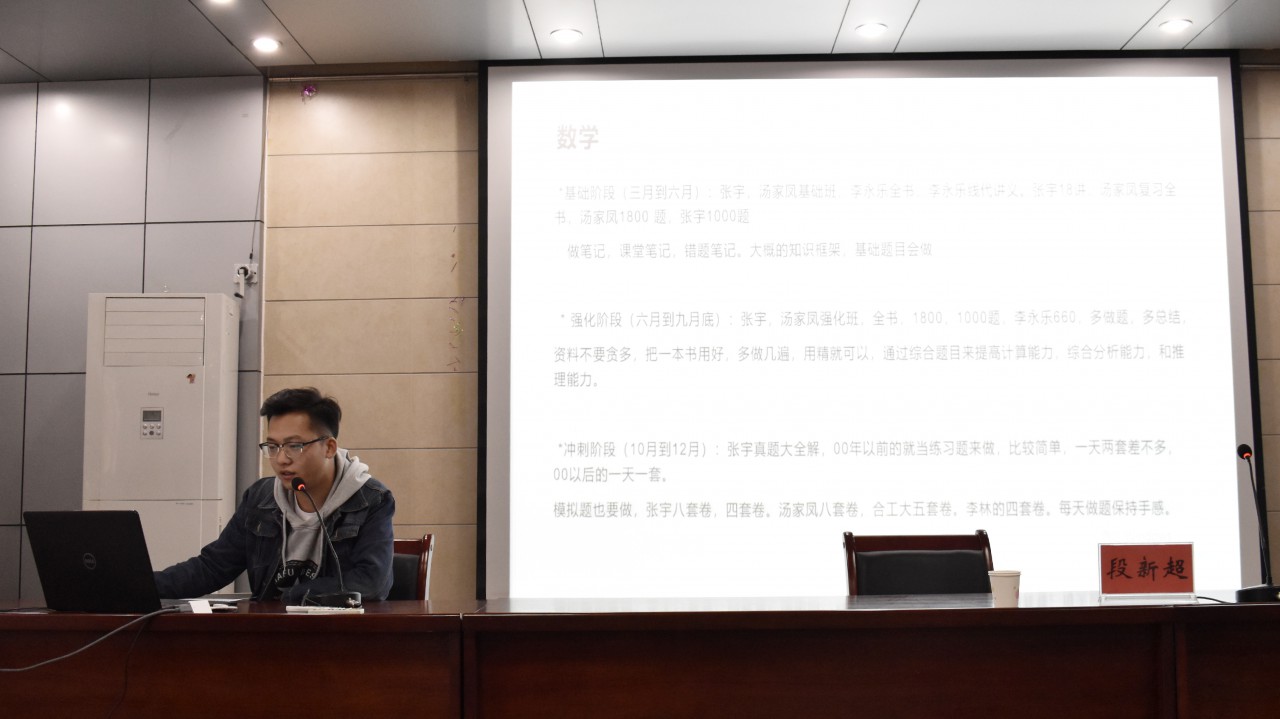 第一位向大家传授经验的是考取山东大学研究生的路静文。首先,她向同学们说明了时间规划的重要性,向大家展示了自己的学习时间表,告诫同学们要对开学到期末每一段时间都进行高效的利用。路静文还向大家介绍了自己的学习方法,覆盖了考研的关键科目,并强调了基础在考研中的重要性。第二位传授经验的是推免至同济大学的冯睿。他详细介绍了学硕、专硕的区别以及报考的优劣势,结合自身经历向大家讲解了夏令营和保研等的注意事项。考取哈工大的段新超向大家总结了考研的几个重要时间点,强调了心态的重要性。在提问环节,同学们积极发问,学长学姐们结合自身经历一一解答,为同学们指明了方向。最后,他们还向大家推荐了多本对考研有益的辅导书。