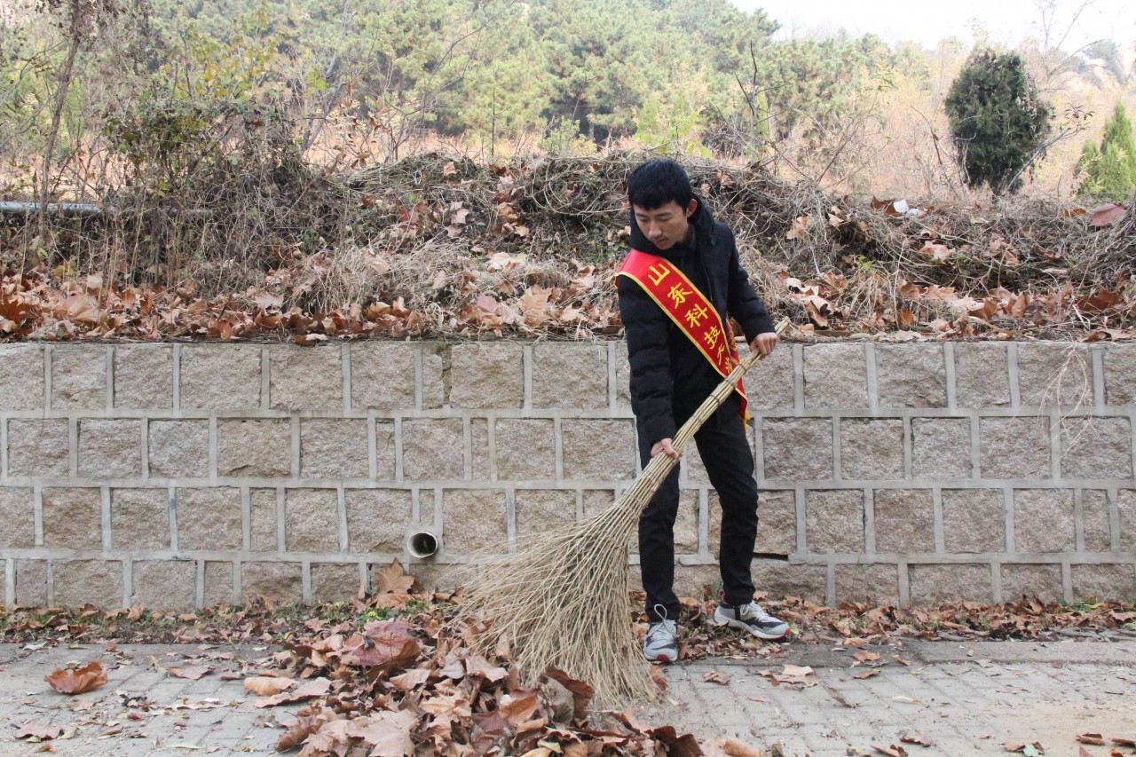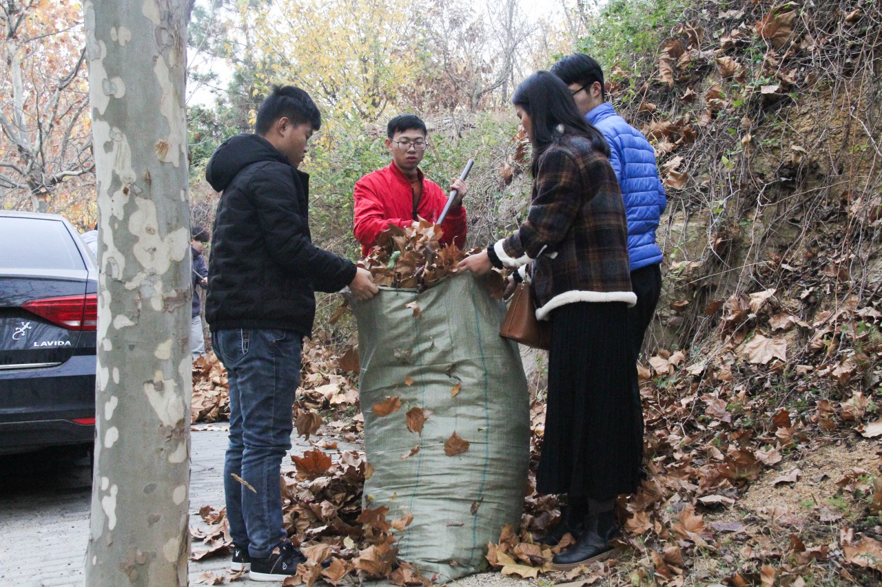 满地落叶像铺成金灿灿的地毯,金秋的落叶堆积了一层又一层。清晨8点整,各公司的志愿者摩拳擦掌,开始合作扫除落叶。志愿者们男女分工,男生负责用铁耙把落叶装进落叶袋,用扫帚把落叶扫到一起,而女生负责把持好落叶袋,让男生的工作更加顺利。一堆堆的落叶不一会填满了一个个编织袋,地上的落叶很快被清理的干干净净,街道恢复了原有的宽敞。汗水滑下了志愿者们的脸颊,但志愿者们脸上都洋溢着开心的笑容。