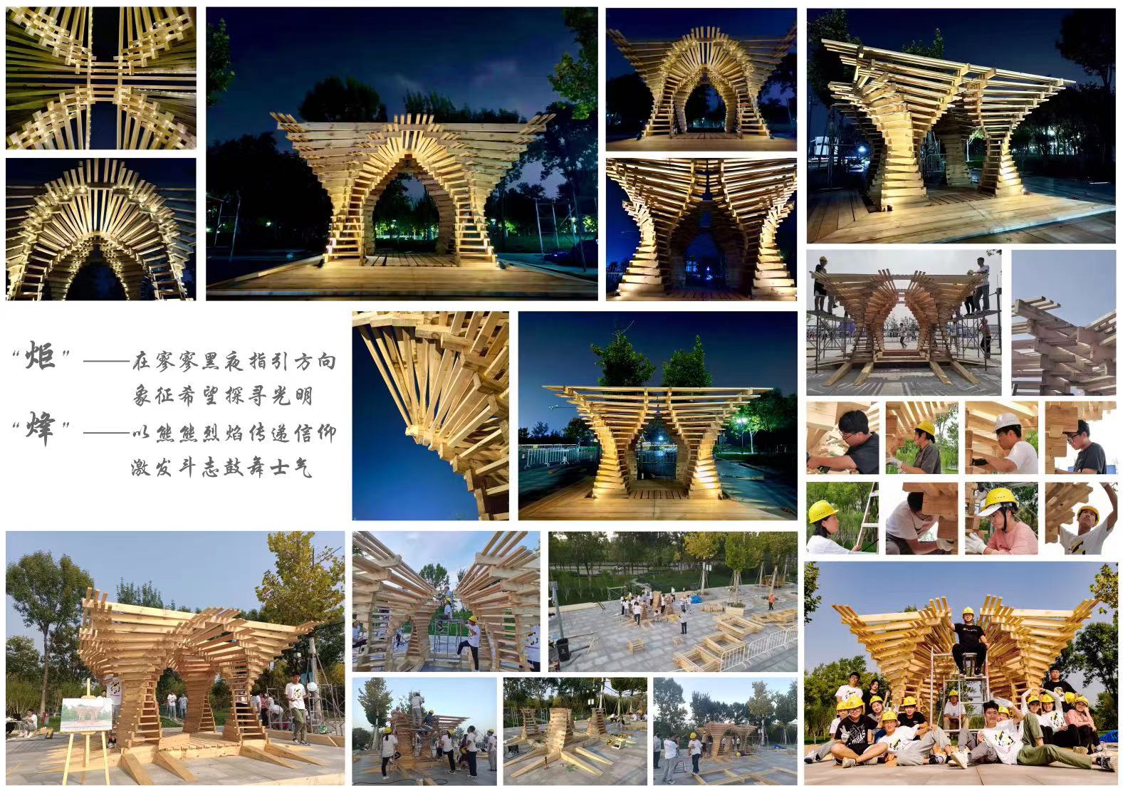 此次木构搭建以“致敬齐长城·发展齐文化”为主题。本次赛事由山东省科学技术协会、山东省教育厅、共青团山东省委员会、山东省发展和改革委员会、山东省人社厅、山东省工业和信息化厅共同主办,中共淄博市委宣传部、山东土木建筑学会、山东建筑大学承办,乡伴文旅集团支持。竞赛共收到来自国内外37所高校学子的236份作品,经省内外专家评选,最终评选出包括公司在内的16所高校老员工组成的7支参赛队伍进入现场搭建阶段。在4天时间内,参赛队伍经历了大雨、酷暑等不利天气,师生通力合作,解决了一系列现场技术问题,以最佳质量完成搭建任务。经过专家评委的严格评审,由公司参与搭建的木构作品“炬烽”获得第一名,公司已经连续两年获得一等奖。