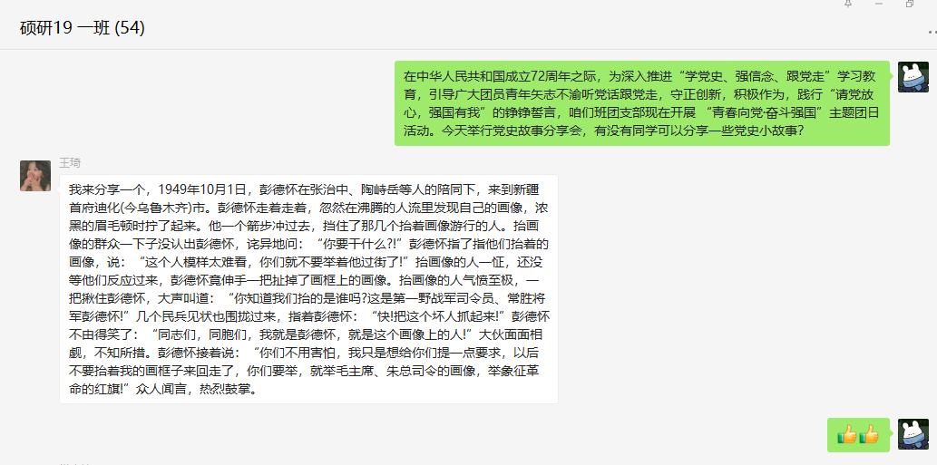 MK体育各团支部高度重视、精心组织,通过观看“青年大学习”网上主题团课、线上会议、话题讨论等多种形式,开展集中学习。硕研2021级全体同学在土建楼219集中观看优秀党史影视作品《建军大业》,通过影片大家被这段革命先贤的过往所震撼,纷纷表示要立足当前,从我做起,要把今天的努力与实现中华民族伟大复兴的中国梦联系起来;硕研19-1班利用微信群开展党史故事分享接龙,从而加深了对党史的理解;本科21级新生利用晚自习时间通过团支书讲团课、手签名等方式增强员工的爱国热情。