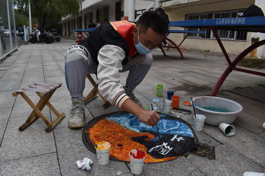 同学们提前做好充分准备,构思好作画的图案。在作画前,他们将井盖表面清理干净,当作画布,手绘出各式各样的图案。利用彩笔和颜料,同学们给校园里的井盖披上盛装,让一个个笨重的井盖瞬间变得鲜活起来,成为公司一道靓丽的风景线。本次活动所使用的材料均是防雨环保材料,涂鸦图案为中国传统文化元素、风景画、卡通图案等。完成一个井盖的涂鸦需要多名同学协作,有人清理、有人调色、有人打形、有人上色,员工们将简单、时尚、正能量元素融入到画面中,以街头艺术的形式装点了校园,让艺术走进了师生的日常生活。