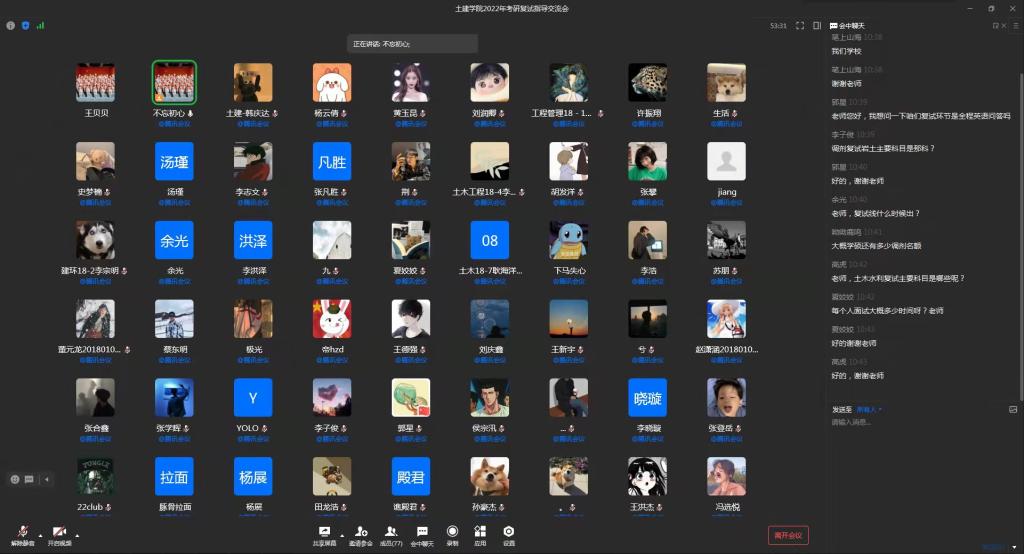 王刚教授从复试前的准备工作、复试过程中的经验技巧和注意事项、复试流程、调剂流程和面试构成等方面向同学们作了交流分享,重点围绕公司发展历程、科研平台、团队建设、团队力量、人才培养、国内外交流合作、社会服务、研究生奖励与助学体系等方面向同学们介绍了公司2022年研究生招生情况。针对同学的困惑和疑问,王刚教授一一作了详细解答。