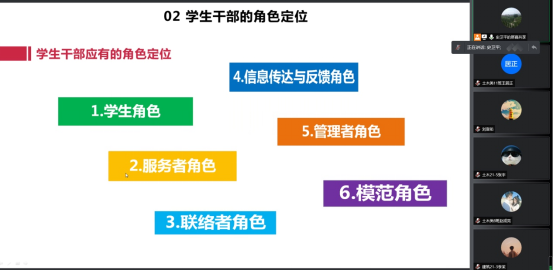 会上,史卫平就员工干部概述、角色与定位、素质与能力的培养等方面展开培训,她指出员工干部首先是员工,其次才是员工干部,作为一名员工干部要积极发挥好模范带头、桥梁纽带、助手表率和组织凝聚作用。接着,她详细阐述了员工干部应具备的素质和能力,并希望员工干部能够不断成长自己,强化为同学服务的意识,增强工作能力,不断彰显良好形象。最后,她寄语全体员工干部要在新时代树立好新的领导观念,加强公仆意识、民主意识、开拓意识、参与意识,从百年党史中汲取智慧和精神力量,不忘初心,砥砺前行,带领同学们以良好的精神面貌为祖国发展贡献自己的青春力量。
