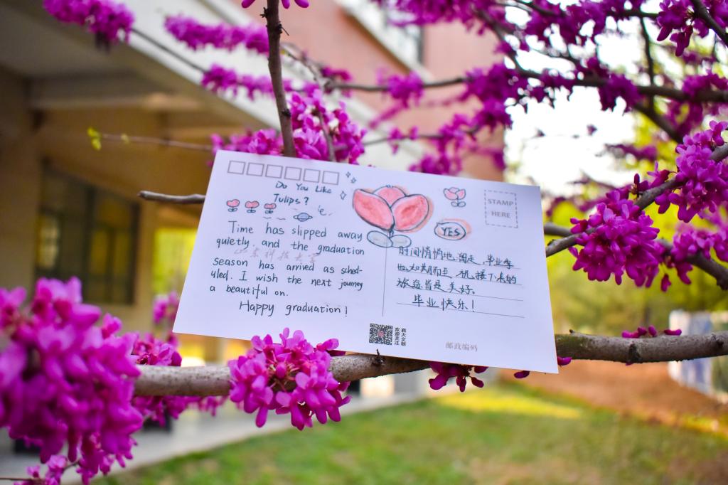 活动中,参与的员工寄情于笔,或书写出自己对毕业生深深的祝福,或描绘出一幅幅色彩斑斓的画作,用自己的真情实意填满整张明信片。随后,同学们将充满依依惜别之意的明信片放置在校园美景中,将祝福遍布整个校园。同学们漫步于墨水河畔,行走于若水园中;于励志坊边走过,在晨读园中徘徊。“挥挥手,作别青春的校园,留下灿烂的笑容,祝你万事胜意”“愿前程似锦,祝未来可期”……这些真挚的祝福语无不承载着同学们的心意。明信片悬挂于万紫千红之间,与满园美景一起,为毕业生送出真挚的祝福。