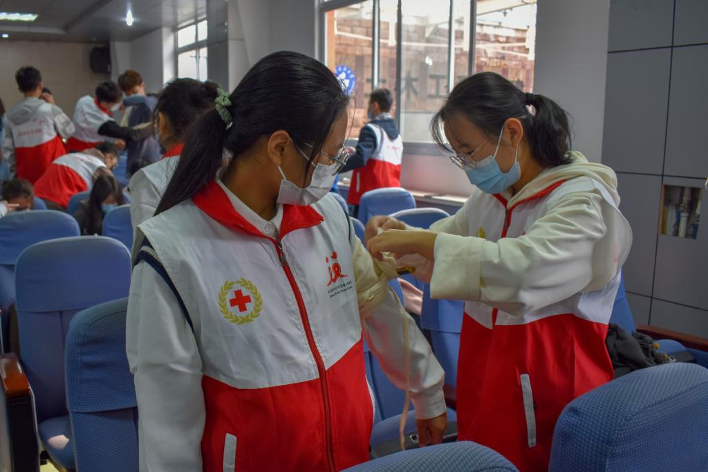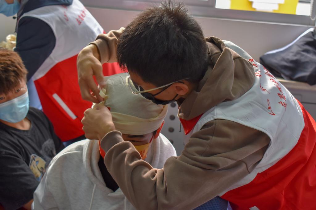 活动伊始,校红十字宣讲人员介绍此次宣讲的主要内容,流程包括血压测量、包扎止血、常见意外应对措施、建筑施工行业五大伤害以及心肺复苏五大部分。在讲解到包扎止血时,宣讲人员给同学们分发了三角巾和绷带,分别介绍并实操了肩部、胸部、头部、八字包扎和止血带止血法。