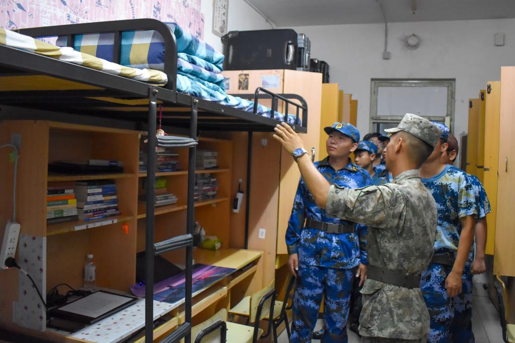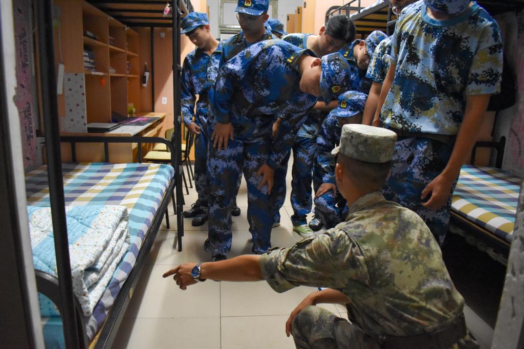 除日常训练外,教官们利用晚训时间逐步讲授“豆腐块”被子叠法,深入员工宿舍,检查并指导同学们整理内务,将每个宿舍都布置得整齐、有序。看着经过教官指点的宿舍,同学们不禁感叹“宿舍原来可以这么整洁。”