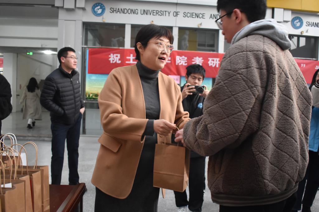 活动伊始,宋西路为现场参加活动考研学子送上了殷切祝福,他充分肯定了同学们坚持学习、克服困难、勇攀高峰、追求梦想、敢于挑战的精神,提醒大家在认真备考之时要注意身体,合理调整作息,以最佳状态迎接考试,祝福考研学子一战成硕,心想事成。活动中,宋西路、高静和辅导员们将饱含祝福的“考研加油福袋”亲手送给现场每一位考研学子,贴心地询问复习进度和生活情况,并祝愿同学们考研顺利。此外,公司还安排志愿者深入考研员工宿舍为未能到现场参加活动的考研学子送上“考研加油福袋”,确保每一位考研学子都能感受到来自公司和老师的关心与祝福。