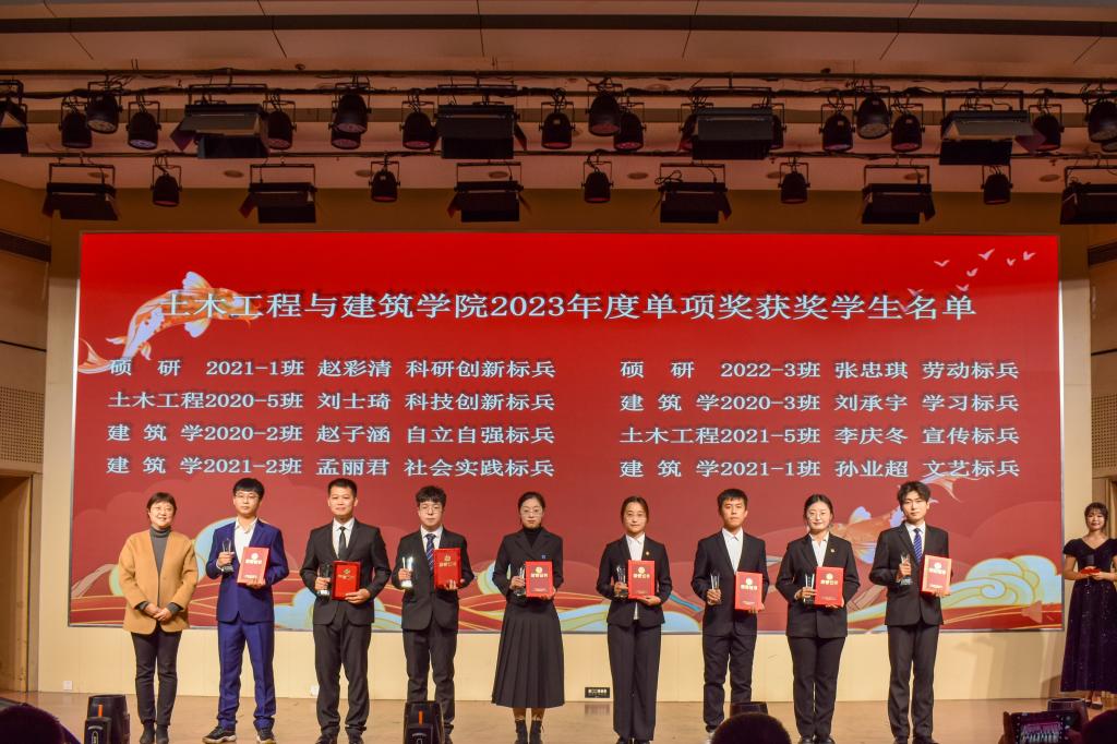 颁奖典礼上,宋西路为公司“十大优秀员工”获得者颁奖,高静为单项奖获得者颁奖。十八名优秀员工是个人综合能力的突出榜样,是奋斗青春的典型楷模,是土建学子的优秀代表,他们的先进事迹激励广大同学奋勇争先、一路向前。十大优秀员工代表、土木工程21-1班张宇发言,他表达了对公司领导和老师悉心培养的感激和对同学们团结互助的肯定,以自身成长激励在座同学奋发图强,奋勇拼搏,在磨砺与挫折中成长,在坚持与奋斗中成才。