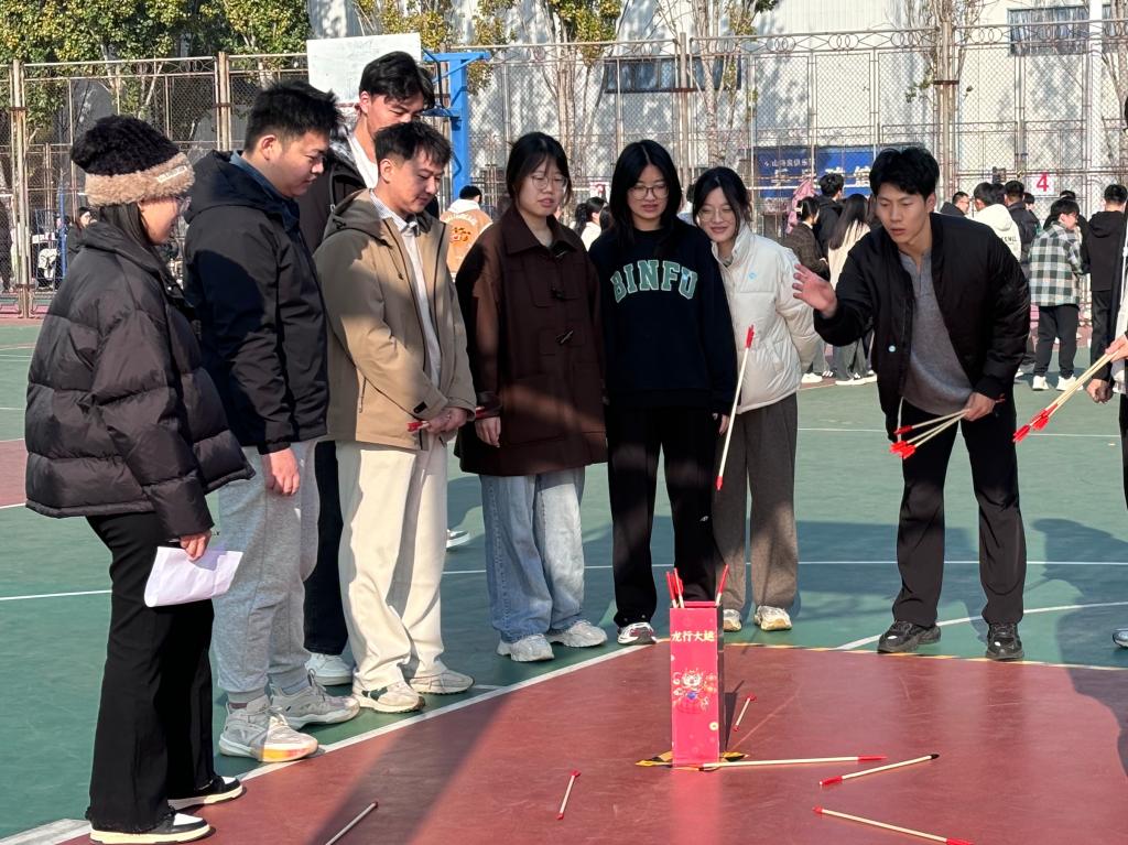 本次趣味运动会共设袋鼠跳、穿越时空、珠行万里、趣味投壶、正话反说、传声筒以及附加项目凑钱花、老鹰抓小鸡、丢手绢等九个项目。袋鼠跳项目中,选手们化身活泼的袋鼠,在赛道上奋力跳跃,展现出无限活力;穿越时空项目则要求选手们敏捷地穿越呼啦圈,考验着他们的反应速度和身体协调性;珠行万里项目里,队员们齐心协力,通过默契的配合将小球顺利传递至终点;趣味投壶项目让大家感受到了传统文化的魅力,正话反说和传声筒项目则充分挑战了选手们的思维反应能力。附加项目凑钱花、老鹰抓小鸡、丢手绢更是勾起了大家的童年回忆。这些项目不仅丰富了运动会的内容,更增进了同学们之间的友谊和团队合作精神。