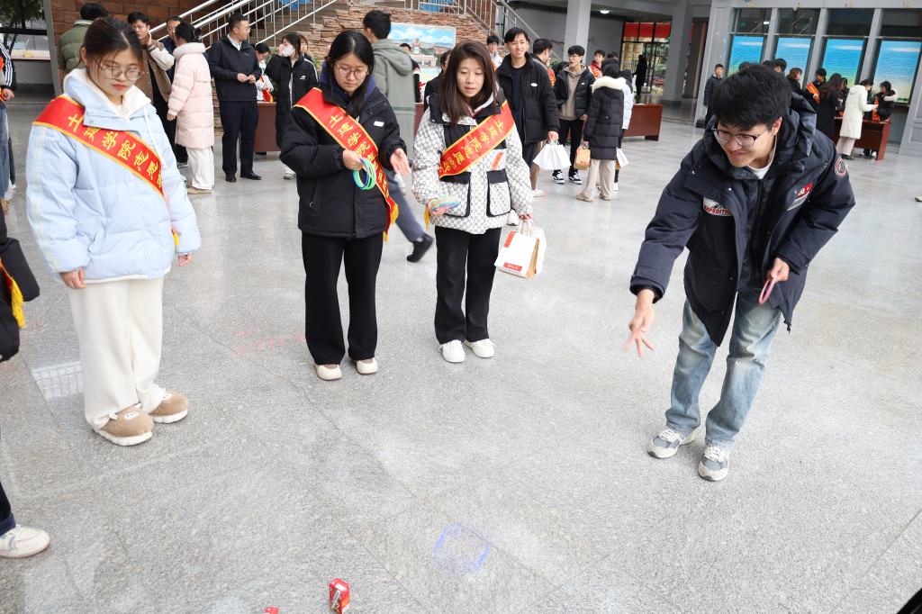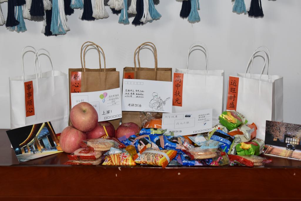 活动现场,志愿者们精心布置,为考研学子准备了丰富的礼品,包括平安喜乐的苹果、事事顺心的柿子、称心如意的的橙子、一举夺魁的橘子等礼品。宋西路、高静和团委辅导员老师们将“考研加油福袋”亲手送给现场每一位考研学子,贴心地询问复习进度和生活情况,并祝愿同学们考研顺利。此外,志愿者还深入考研员工宿舍,为未能到现场参加活动的考研学子送上“考研加油福袋”,确保每一位考研学子都能感受到来自公司和老师的关心与祝福。活动还设置了互动环节,通过套圈、小黏手游戏和写祝福语让考研学子们相互鼓励、交流心得。活动现场气氛热烈,笑声不断,让紧张备考的学子们暂时缓解了备考的压力。