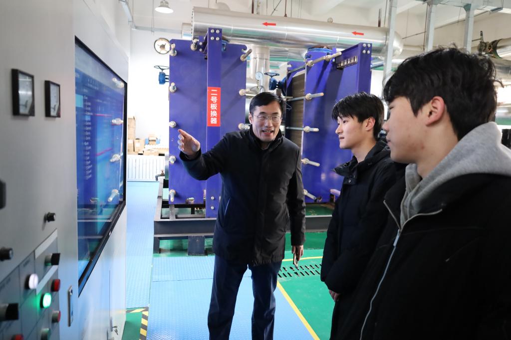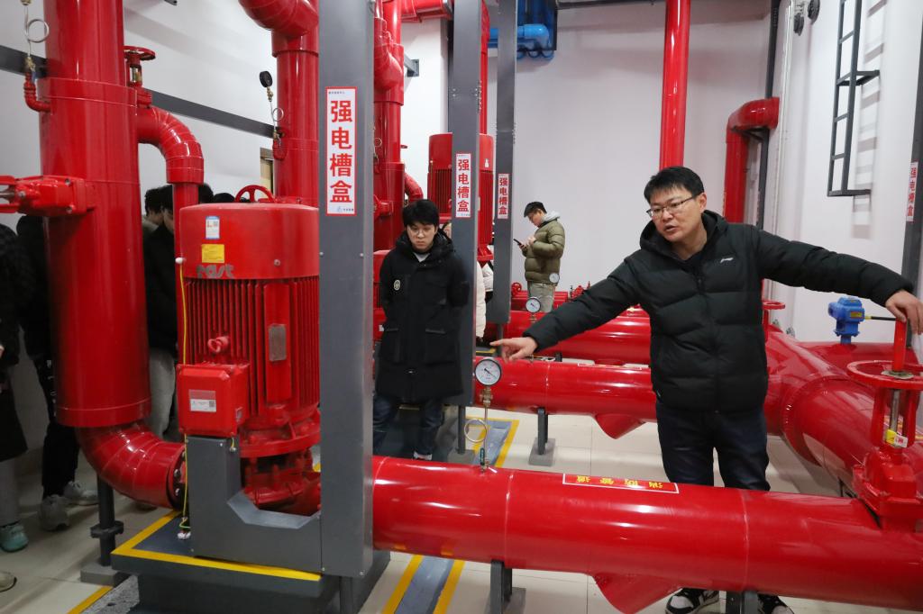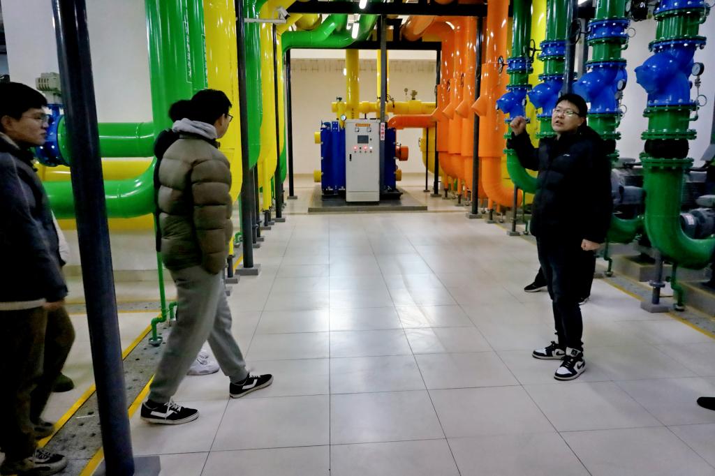 孙清典首先带领同学们来到公司供水供热泵房,详细介绍了公司站点分布、耗电、供暖及供水情况,并深入讲解了供水回水设备、水罐仪器设备及其供水原理,让同学们对校园基础能源供应设施有了直观的认识。随后,在韩庆防的带领下,同学们来到图书馆地下室,同学们参观了消防泵房、变配电室等设施,还了解到地下停车场雨棚、保温管道的材料使用细节,进一步拓宽了同学们的专业视野。最后,全体人员聚集在校东门建设施工现场,刘志强为同学们讲解了工地工程勘测、开挖、打桩、验收等施工顺序,强调了依据国家规范施工的重要性,使同学们对建筑施工流程有了清晰的认知。