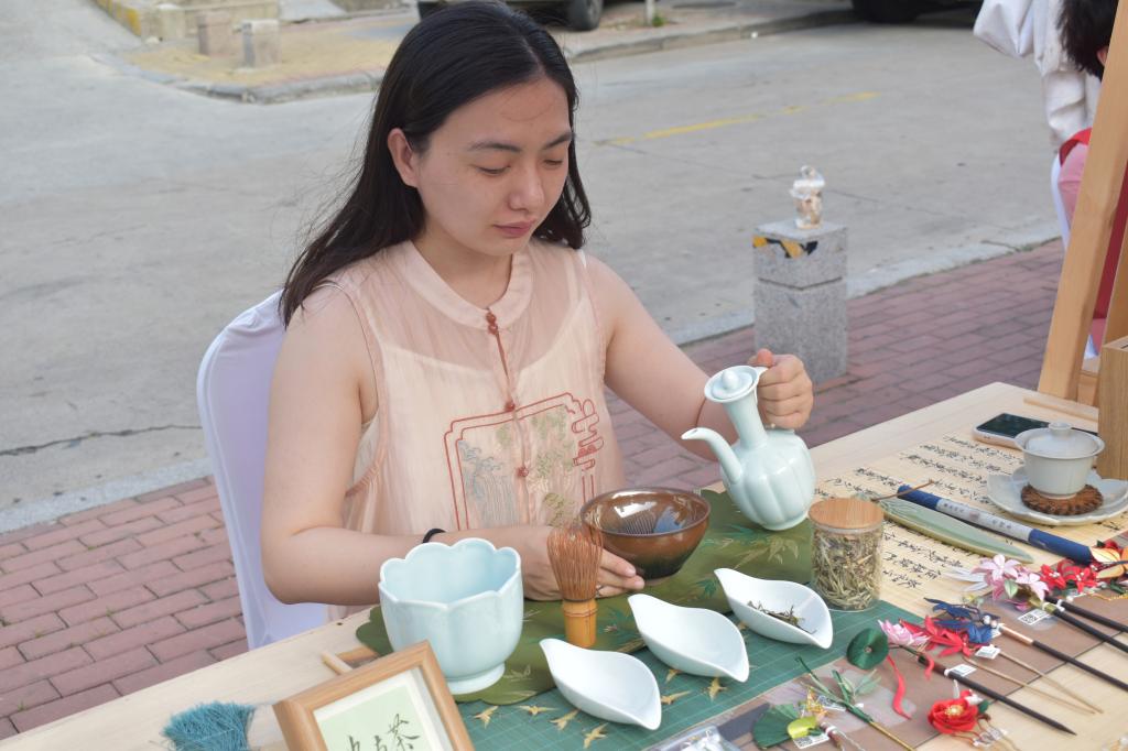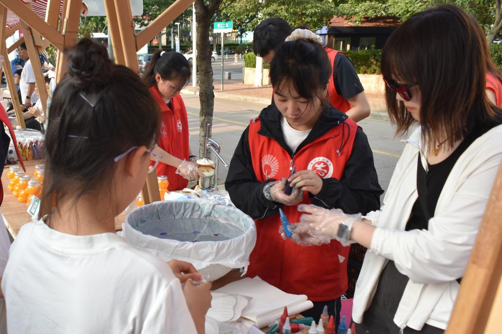 活动现场,漆扇工艺展位前,非遗传承人耐心讲解着“三涂九染” 的古老技法,员工们跟随讲解,小心翼翼地握着画笔,在扇面上勾勒出简单的云纹。青瓷茶具在茶盘上排列有序,同学们正跟着志愿者们学习,一步步体验乌龙茶的冲泡流程:温杯、置茶、注水、出汤,每个动作里都透着好奇。这些传统工艺不仅具有观赏价值,更蕴含着深厚的文化内涵,让同学们在轻松愉悦的氛围中,真切感受到了传统文化的独特魅力。