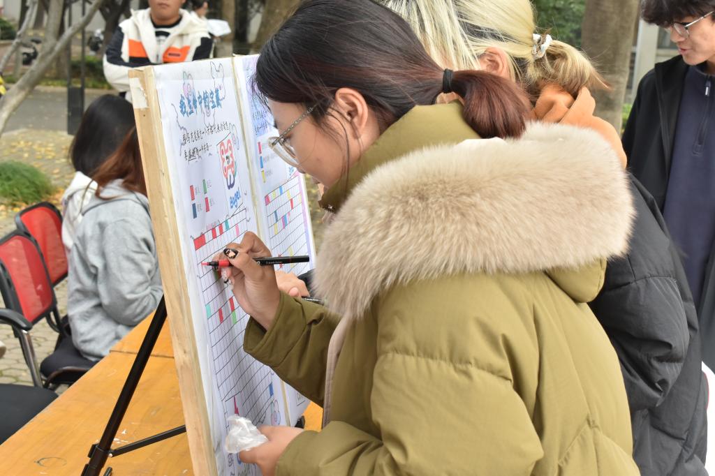 本次活动以画板绘画为主,现场设置大型主题画板,清晰划分了四个情感主题区域。每个区域设有3-4个具体的情感选项,参与员工根据个人感受来选择代表不同情感色彩的马克笔,在画板对应区域进行填涂,完成属于自己的“情绪涂鸦”。除此之外,现场还设置了互动环节,同学们欣赏不同参与者的作品并进行留言,直观感受群体情感的共鸣,以促进彼此之间的交流,深刻体会个人与集体的联结,有效打破了人际隔阂,营造了共情、温暖的校园氛围。