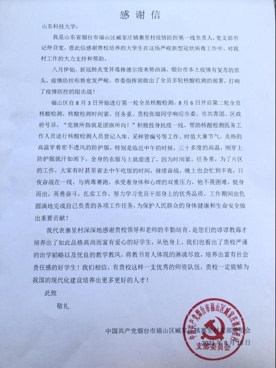 近日,MK体育收到中共烟台市福山区臧家庄镇寨里村支部委员会的感谢信,了解到公司土木工程2019级2班员工张璇在暑假期间主动站到了抗“疫”前线,在烟台市福山区臧家庄镇寨里村一线参与全员核酸检测工作。