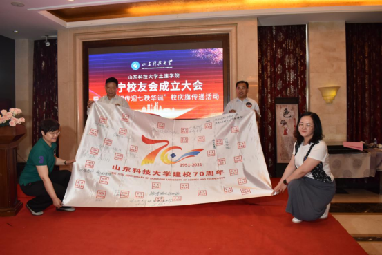 在“薪火相传迎七秩华诞”校庆旗传递活动中,滕州员工会会长王宠、外语公司济宁员工会会长常黎黎分别致辞,滕州员工会代表将校庆旗传递给济宁员工会代表,徐炳辉和常黎黎分别在校庆旗上写下对母校70华诞的诚挚祝福。