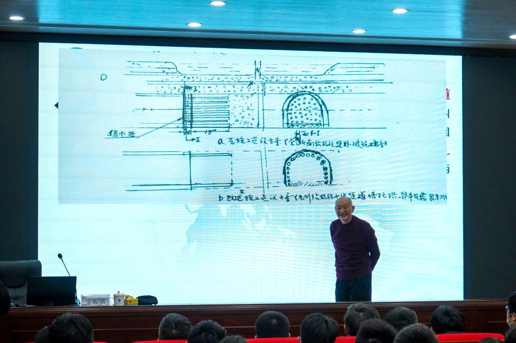 宋振骐结合习近平总书记在院士大会上的讲话,站在科学技术最前沿,贯通过去、现在和未来,以科学家和教育家的独特眼光,从创新驱动、全民共举、强化领导、法治保障四个方面讲解了习近平新时代中国特色社会主义思想的本质特征。讲到兴致处,宋振骐站身起来,为在座的老师与同学们仔细讲解了厦门翔安海底隧道工程是如何进行的,讲述了通过采用先行钻孔注水泥浆造墙托拱,铲斗机直接开挖装车推进的施工方案,使得项目取得了提前两年建成通车运行的重大成果。