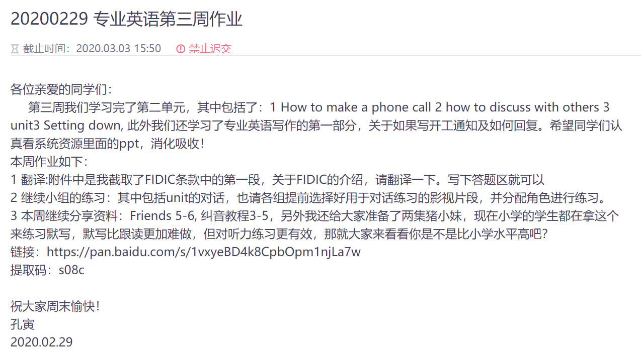 工管系孔寅老师的《建筑企业管理》课程采用的是智慧树平台语音直播,员工使用知到App在线听课。上课期间老师可以通过随机点名来检查员工是否在线听课,也可以点名后让员工弹幕来回答问题。课前课后则利用智慧树平台来布置预习任务和课后作业,设置截至日期。同时,借助智慧树现有的一门《企业管理》课程来建立了异步SPOC(Small Private Online Course,小规模限制性在线课程),可以通过学情数据来及时了解员工课下自学慕课的情况。孔寅老师教授的另一门课《专业外语》,则是使用了雨课堂的视频直播,同时借助于中国大学Mooc的《商务英语口语与实训》来建立异步SPOC让员工课下自学。工管17-1班于丽娜反馈到,“孔寅老师会不定期抽查员工小组合作练习的口语对话以及我们每日听读China Daily后在喜马拉雅上的录音等,她再对我们的发音进行点评纠正。同时,孔老师经常分享双语美剧等资源,传授好的学习方法,拓展我们的视野思维”。