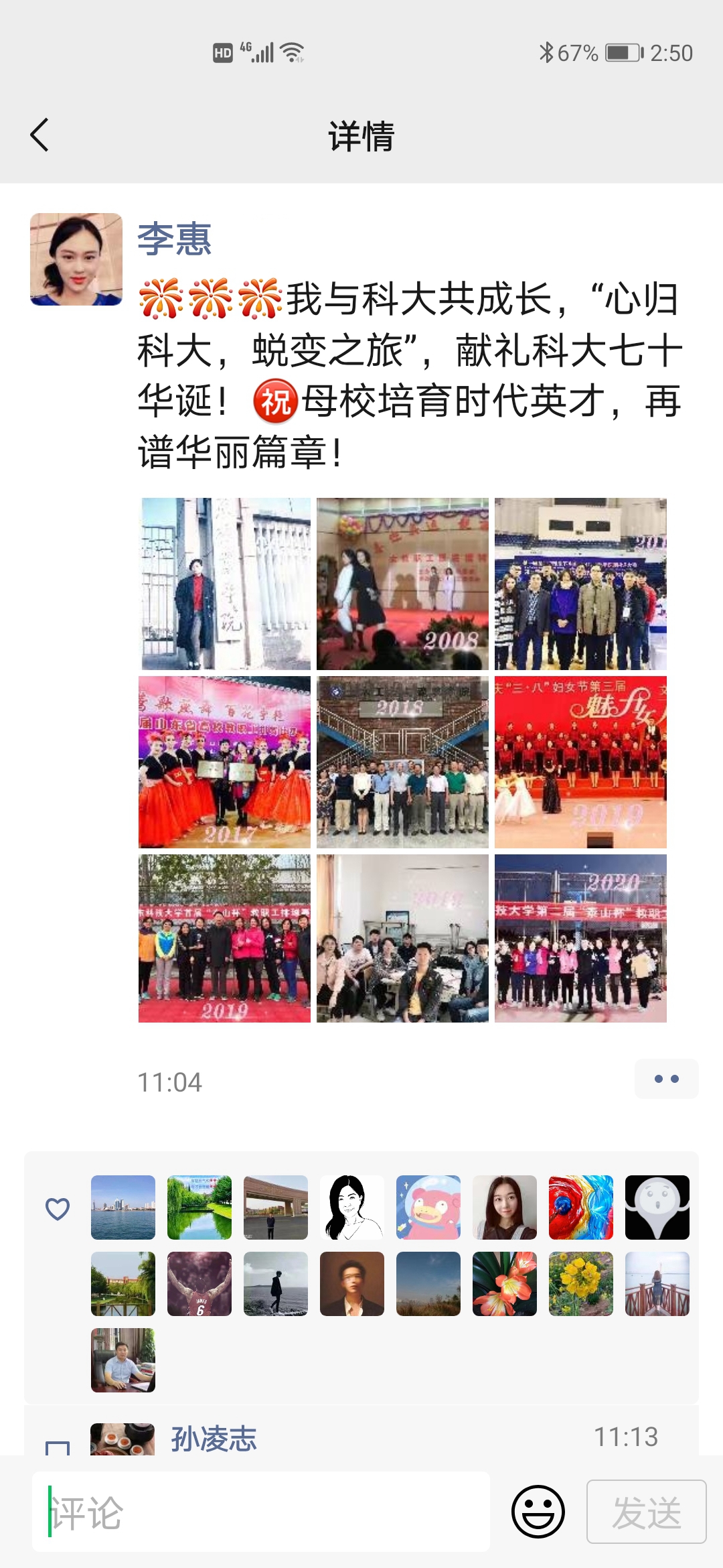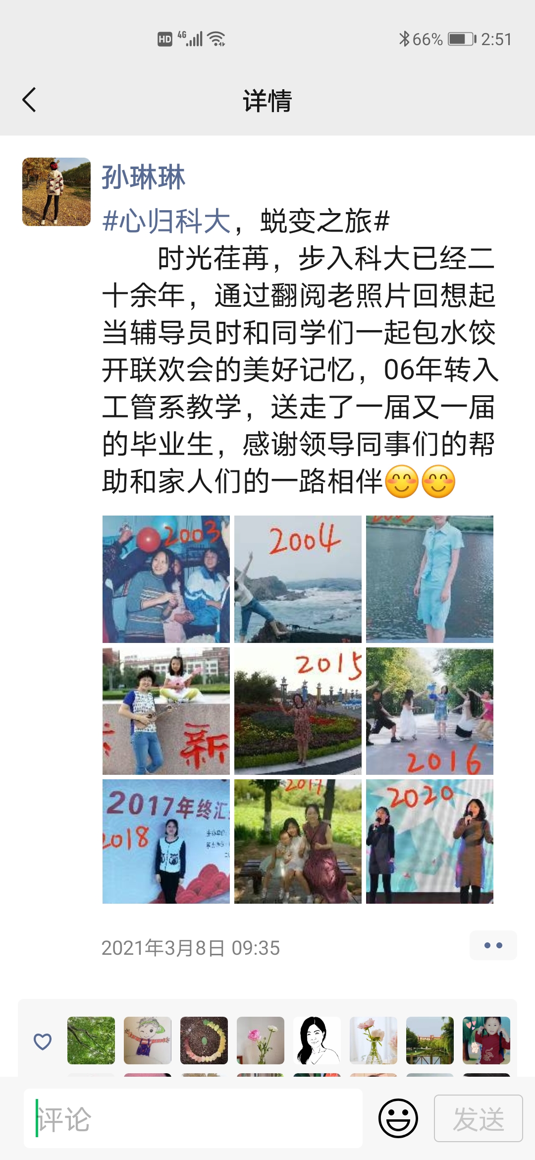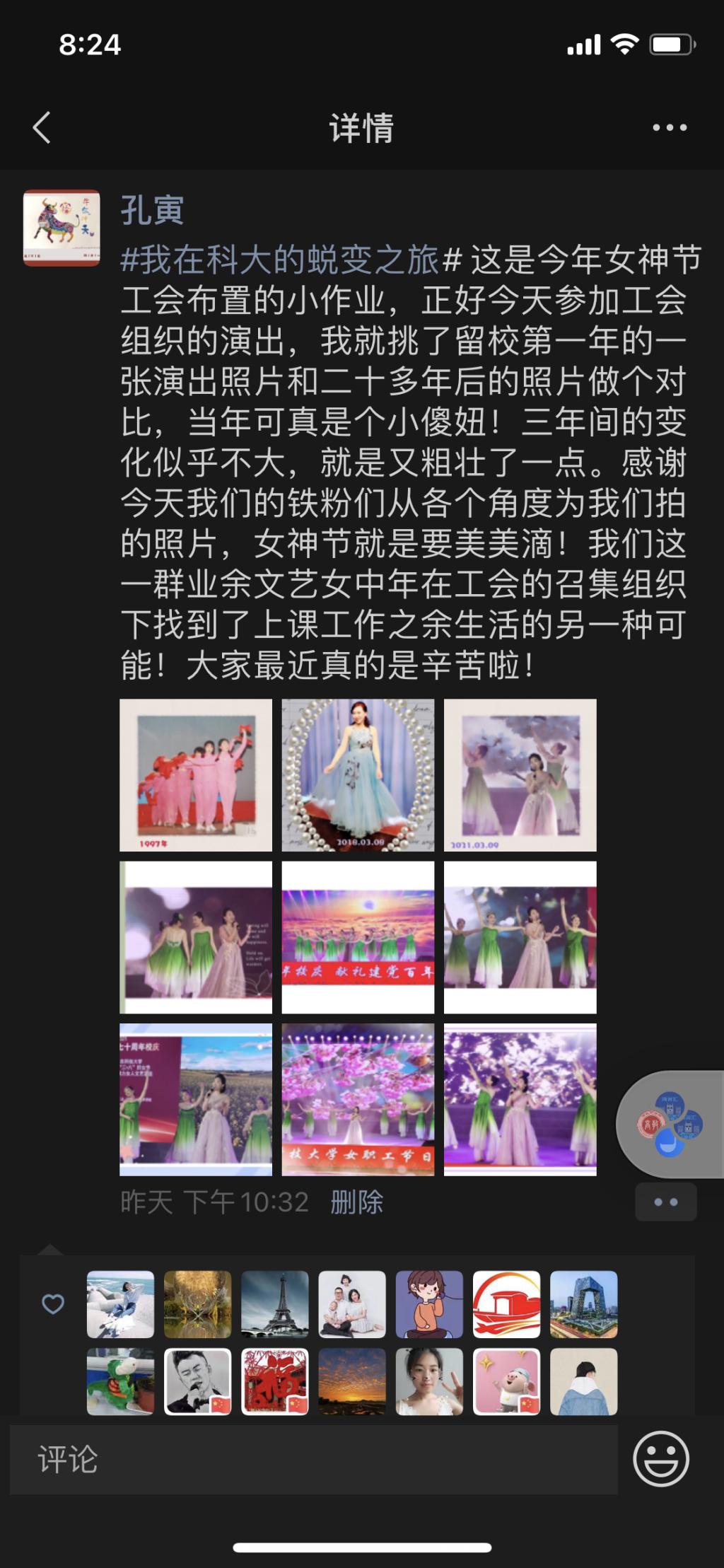 公司女教职工整理自入职科大以来个人或者公司景物的变化照片,按照年份顺序发送朋友圈,配上含有“#心归科大,蜕变之旅#”的心路历程。四季更替,岁月沉淀,女教职工在科大逐渐蜕变成蝶。教苑群芳,女教职工讲台上做最美园丁,传道授业,讲台下是百变女神,绽放魅力。
